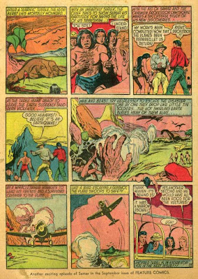 "Valley of the Cavemen" also introduces Prof. Ford Cawthorne and an unfortunate tribe of cavemen (all but one of whom dies), so obviously things were pretty rotten in Samar's neck of the woods. This strip had an interesting assemblage of artists working on it including the great Chuck Mazoujian and Ann Brewster, a female artist in American comics during the 1940s and 1950s. At that time, she was affiliated with studios like Binder, Chesler and Iger, but her earliest known credit was 'Samar' for Quality Comics (1941). Some of her work will eventually turn up here!
